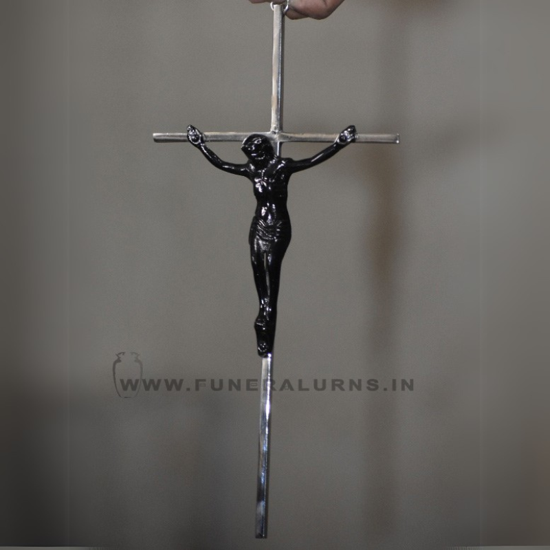 Metal crucifix featuring a silver cross with a black-toned Jesus figure.