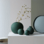 These are Cooee Design Ball Vases in varying sizes and a deep green color. The matte, smooth finish is characteristic of Cooee Design. One vase holds a delicate, dried floral stem. There’s also a larger, flat, disc-shaped object in a muted grey-blue, which is another signature Cooee Design piece, likely a tray or another vase form.