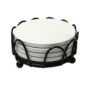 This set features round, absorbent ceramic coasters designed to protect your furniture from moisture. They are neatly stacked in a black loop wire holder with small ball feet, offering a practical and subtly stylish addition to your tabletop.