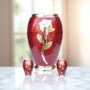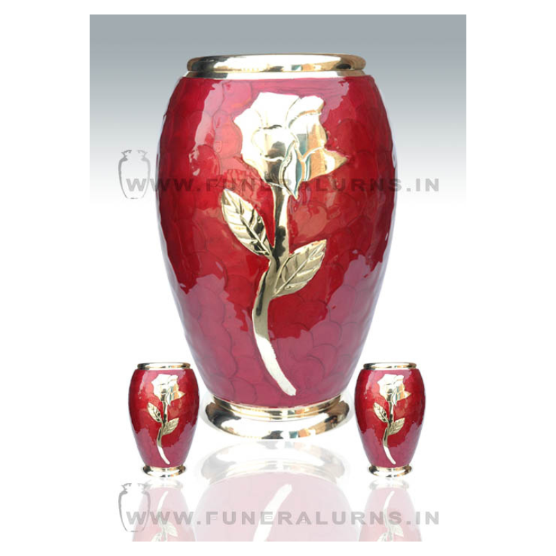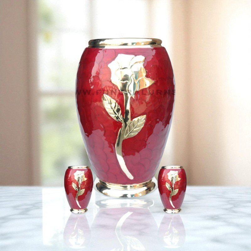 A radiant red urn set featuring a gold-embossed rose design—symbolizing love, honor, and eternal remembrance. Includes matching keepsake urns. 4o