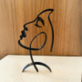 This is a handcrafted abstract sculpture depicting a woman’s face in a minimalist, continuous line style. The sculpture is made of black metal, with the single, flowing line forming the profile of a face looking upwards, including the eye, nose, and lips. The line then curves down to create a stylized neck and bust, supported by a simple, curved metal base. The abstract nature of the piece focuses on the essence of the form, offering a modern and artistic aesthetic.