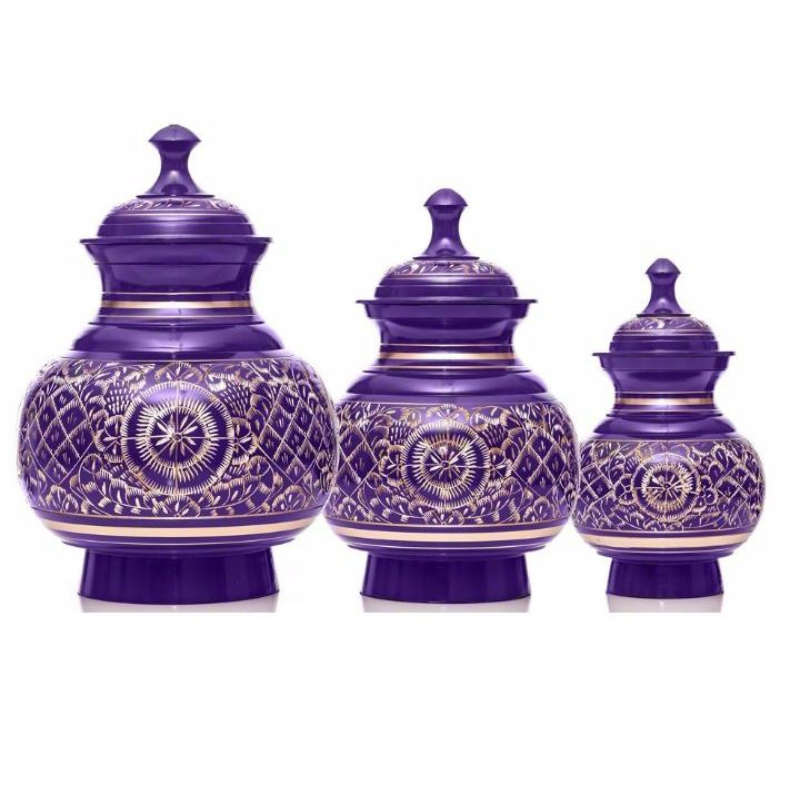 These traditional urns boast intricate hand-etched floral patterns in deep purple and gold. Ideal for families wishing to divide ashes or display a beautifully ornate keepsake.