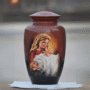 This urn features a serene and detailed painting of the Madonna cradling baby Jesus, representing love, protection, and eternal maternal care.