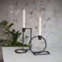 These are Modern Black Metal Candle Holders, a set of two with distinct geometric designs. One features a rectangular base supporting a vertical stem with a circular element, while the other has a circular base with an angular, open rectangular frame. Both hold slender taper candles, offering a contemporary and minimalist aesthetic.