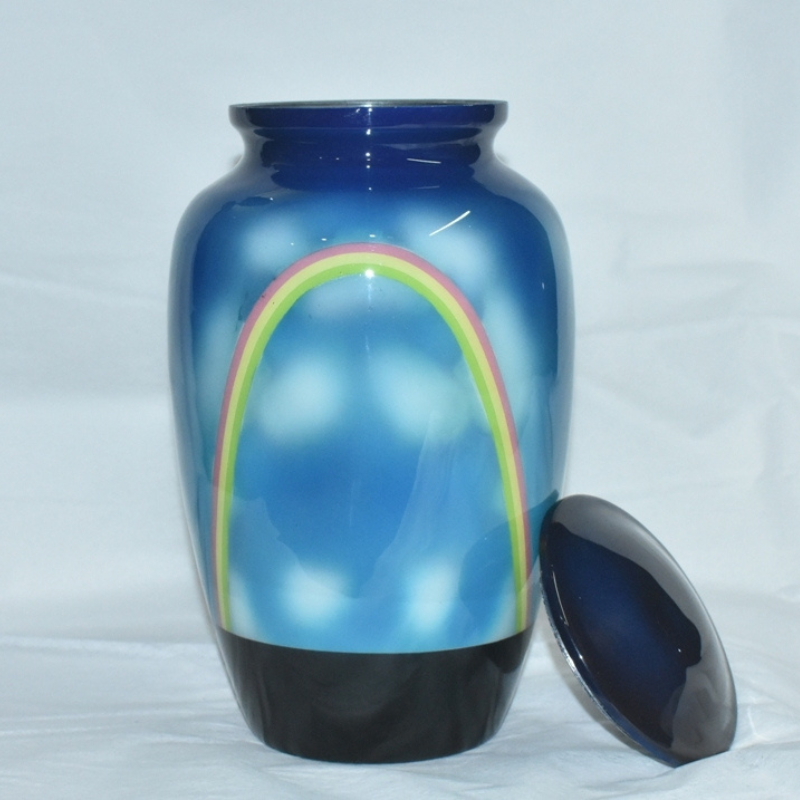 A calming urn with a bright blue sky background and a soft rainbow arch, symbolizing hope, peace, and the bridge between earth and the afterlife.