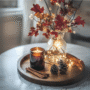This is a Round Wooden Serving Tray styled as a fall centerpiece. It holds a lit amber jar candle, cinnamon sticks, pinecones, and a clear glass vase filled with artificial fall foliage and warm-toned string lights. This arrangement creates a cozy and autumnal decorative display.