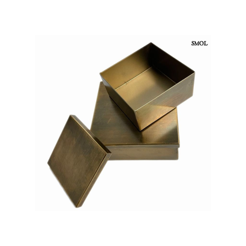 These are Square Brass Boxes, a set of three nesting boxes with a brushed brass finish. They offer a stylish way to store and organize items, and their square shape adds a modern touch.