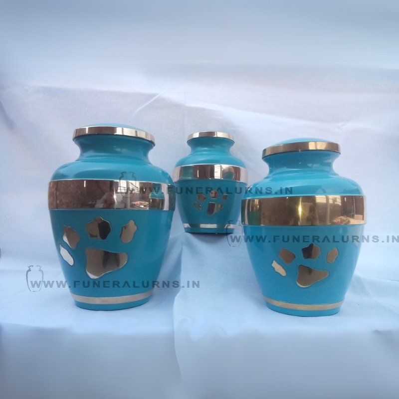 Striking turquoise urns with polished silver accents and cutout paw prints create a modern and touching tribute for pet ashes. Suitable for display or keepsake use.