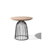 This modern coffee table features a distinctive cage-like base made of black metal wires, supporting a round, light wood tabletop. Its airy and sculptural design adds a contemporary touch to any living space.